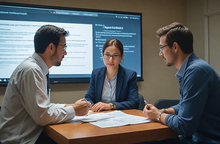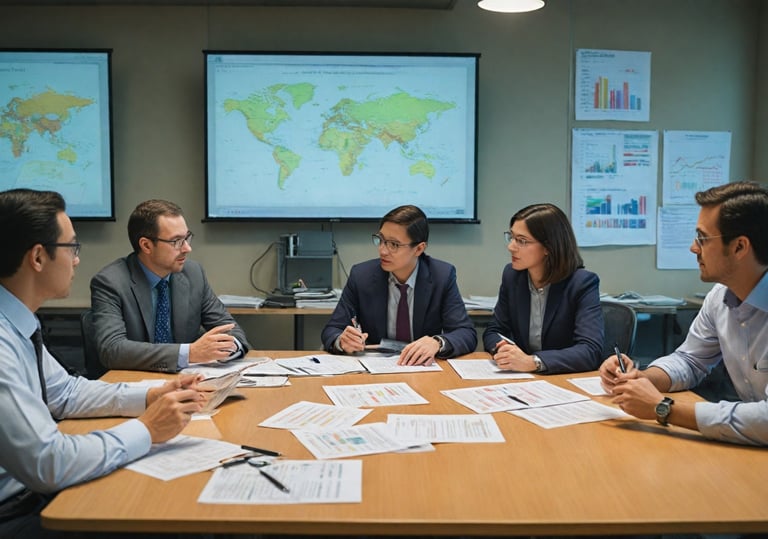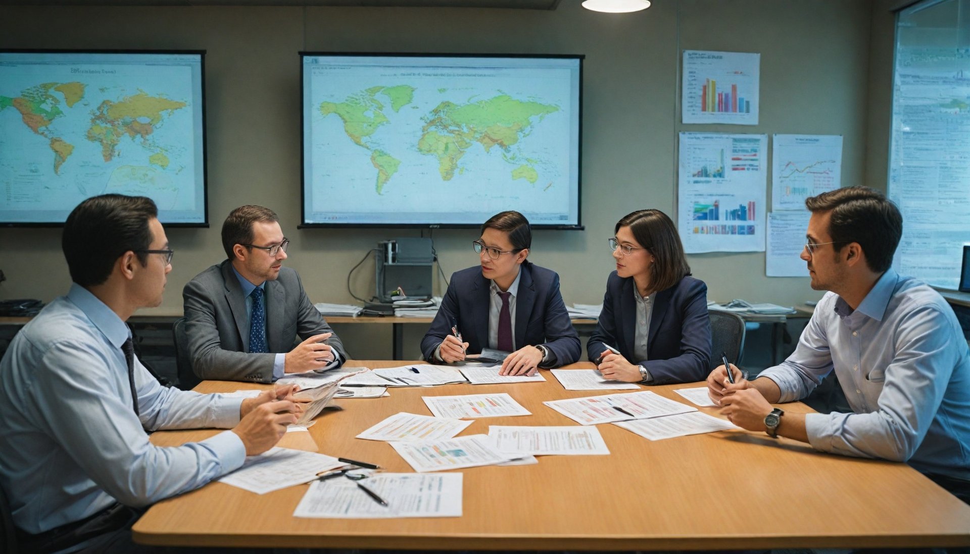 "A team of researchers engaged in a discussion about ethical research practices, with maps and charts in the background, emphasizing a collaborative and analytical environment."