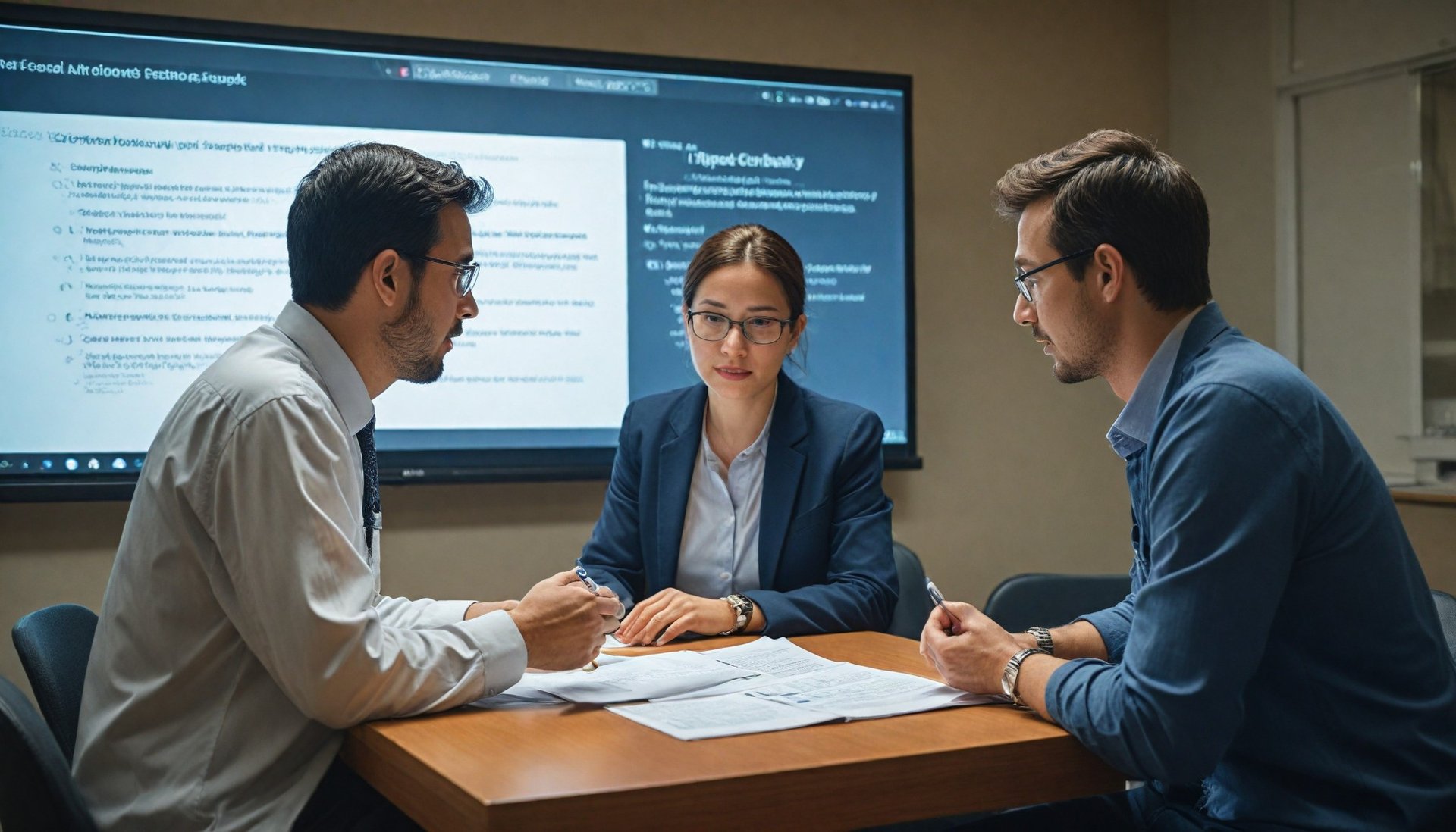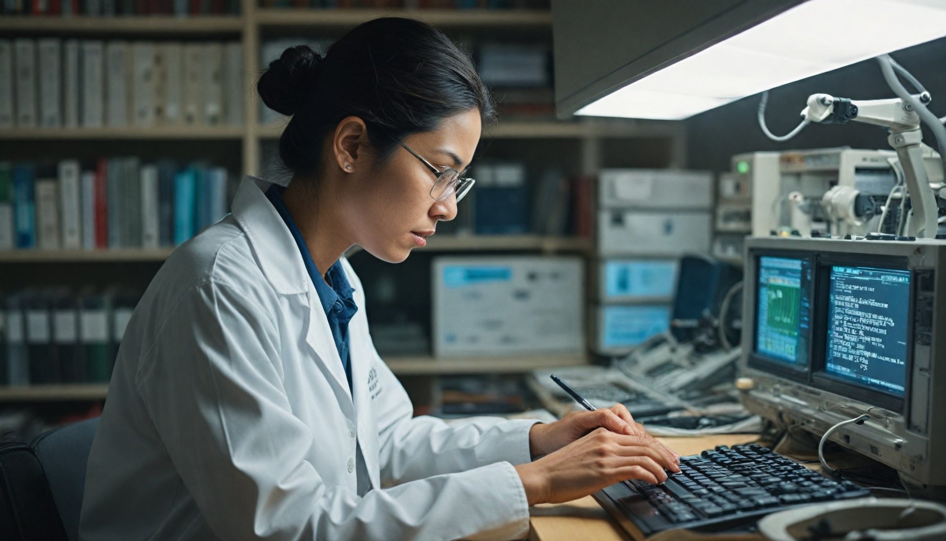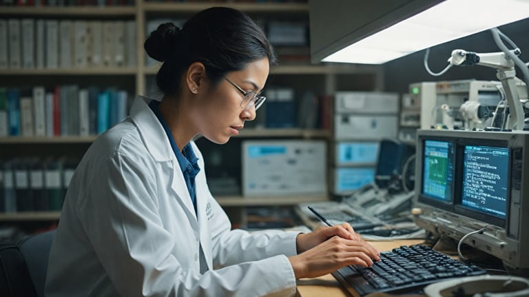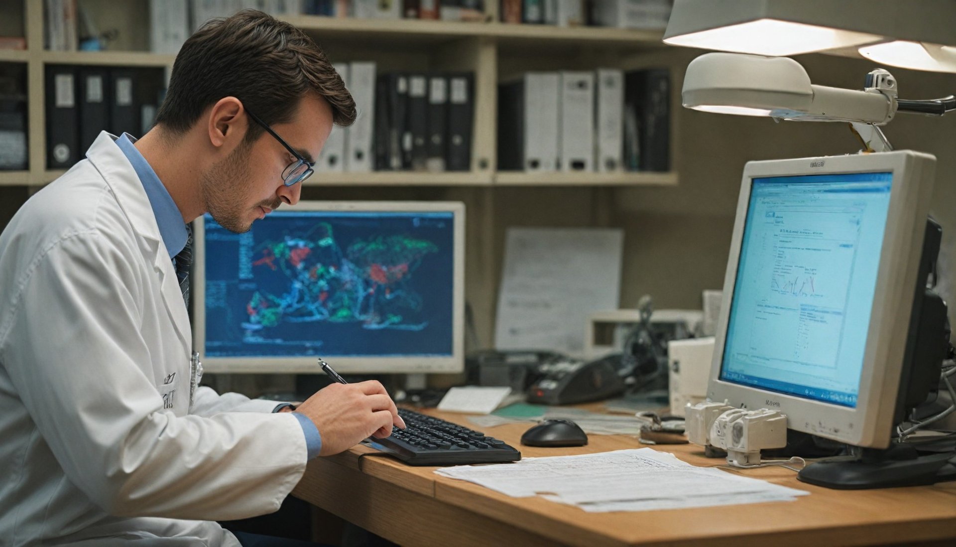 "A researcher conducting a risk assessment, analyzing data on computer screens in a professional environment."